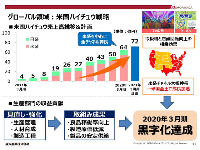 販売面においては、特に米系チャネルへの導入や店頭回転の向上が全体の伸長を牽引しております。テレビCM等の広告・販促施策により認知度やトライアル率の向上を図ることで、先行して取組みを進めてきた西海岸などのエリアのみならず、米国全土へと売上成長が加速しております。