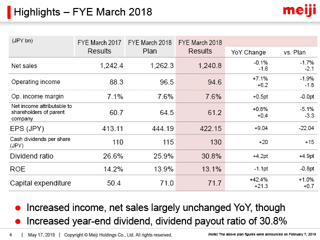 • Net sales were largely unchanged year on year but operating income increased by 7% to JPY 94.6 billion.