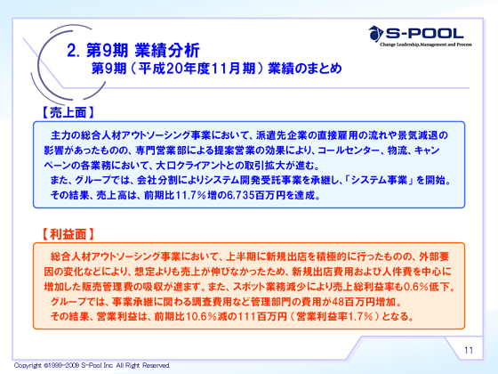 売上面では、主力の総合人材アウトソーシング事業において、派遣先企業の直接雇用の流れや景気減退の影響がありましたが、専門営業部による提案営業の効果により、コールセンター事業やキャンペーン事業、物流事業は少々予算を未達でありますが、大口クライアントとの取引拡大が進んでおりますのでそれなりに順調に進んでいます。