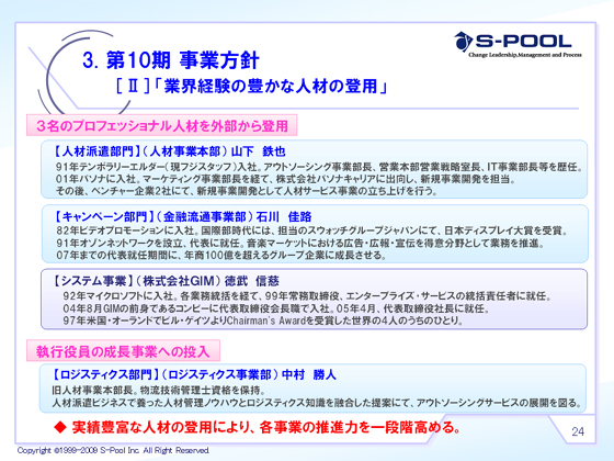 まず、人材派遣部門が山下鉄也を登用しました。元パソナ関係のキャリアになります。それから、キャンペーン部門に関しては、石川佳路を登用しました。元オゾンネットワークという広告代理店の創業者になります。そしてシステム事業に関しては徳武信慈を登用しています。元マイクロソフトの常務で子会社のGIM社のマネジメントをしております。