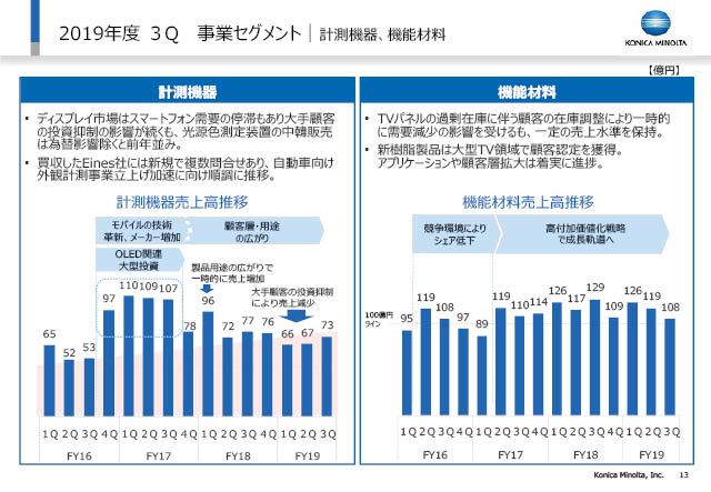 産業用材料・機器の計測機器においては、スマートフォン2020年モデル向け投資に関連する先行受注分が出荷されました。自動車外観計測は、買収したEines社に新規の取り合わせが複数あり、成約拡大に向けて取り組んでいます。