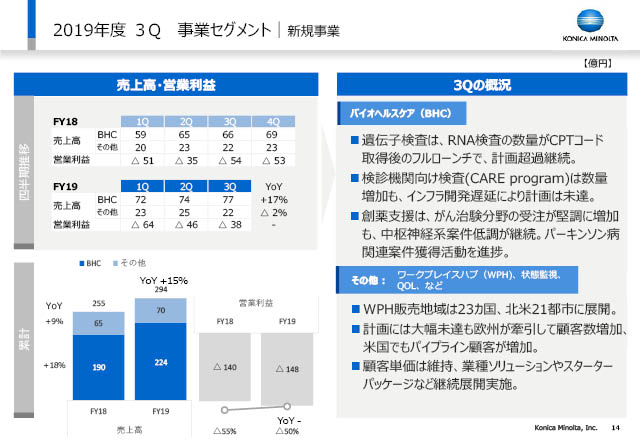 新規事業は、バイオヘルスケアやワークプレイスハブの増収やトップラインに応じた経費コントロールにより14億円の増益に転じました。