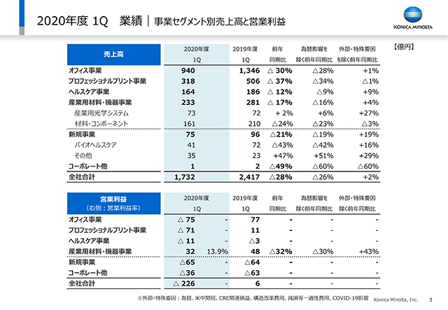 1Qにおいて、コロナの影響がどれぐらいあったかを示しています。全社の売上で約675億円、営業利益は約300億円の影響を受けました。オフィスおよびプロフェッショナルプリント事業に関しては先ほどご説明した通りです。ヘルスケアでは、病院への来院患者数が減少したことに伴う売上減に加えて、そういった中で思うように商談が進められないという影響がありました。材料コンポーネントのインクジェットヘッドでは、主に中国のメーカーから当社ヘッドを組み込んだプリンターが輸出されますが、その輸出先の国がコロナの影響を受けて停滞しました。光学コンポーネントでは、プロジェクタ用のレンズ販売が減少しています。機能材料はテレビ需要の減退により高付加価値フィルムの販売が減少しました。産業用光学システムでは、計測機器で前期からの持ち越しの受注分を出荷できたことに加えて、大手顧客からの受注を受けて、コロナ影響を受けながらも増収となりました。新規事業のバイオヘルスケアは米国のロックダウンの影響を受けました。