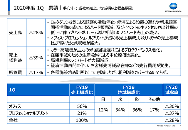 1Q業績のポイントの1つは売上高の減少です。ロックダウンに伴う顧客の活動停止・停滞に伴う機材の設置遅れや、新規の顧客開拓が進まなかったことによるハードウエア販売の減少が拡大しています。また、イベントのキャンセルや、顧客のオフィスへの出社率低下によって、稼ぎの中心となるプリントボリュームが大きく減少しました。この結果、売上高が28%減少しました。これらは当業界全体で共通して発生している事象かとは思いますが、当社の場合、オフィス事業およびプロフェッショナルプリント事業の売上が全社の77%を占める中で、そのオフィスとプロフェッショナルプリントの地域構成を見ると、世界的に見ればコロナの影響が比較的軽微であった日本を除いた海外の割合が9割近くあり、結果として、全社の売上の約7割近くがコロナの影響にさらされたということになります。売上の減収率以上に粗利の減少率がマイナス39%と低下しています。主力のオフィス事業で見ると、プロダクトミックス、地域ミックス、さらにお客様ミックスなどで全体的に粗利額が減少したことに加えて、粗利率も悪化しました。さらに、政策的にキャッシュフローを優先する中で安全在庫も削減することによる生産損益も、粗利に対してはマイナスに影響した部分です。高粗利率のノンハードの落ちも利益率の低下を招きました。さらに、特に直販のお客様における事象になりますが、機械の稼働再開に合わせて消耗品や部品を入れ替えるお客様が増えたことにより、一時的にマテリアルコストも増加したことも挙げられます。販管費については、従来掲げていた想定以上に取り組みを加速した結果、前年同期比で190億円の削減となりましたが、粗利減をカバーするには至りませんでした。一方、将来を見据えた新規事業については、経費の使い方を厳選しながらも、ここは今が踏ん張りどころと考えて急ブレーキを掛けるようなことはしていません。