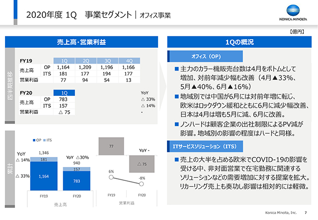 ここからは事業別にポイントを押さえていきます。オフィスセグメントはネガティブな情報ばかりではありません。欧州市場において、当社主力のA3カラーMFPでは、当社はマーケット全体よりも減少率を抑えながら踏ん張っています。これには前期に出した新製品のモメンタムが効いています。地域別でみると、中国が6月から前年を上回るかたちで回復を示しています。ITサービスは、月次のリカーリング売上が中心であり、対前年比でも減少幅は相対的に軽微で、2Q以降にもつながるとみております。