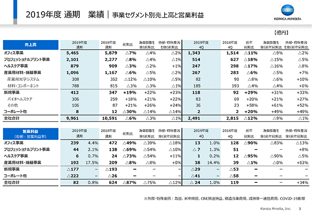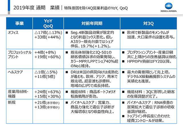 オフィス事業は、4QでSeg.4の新製品効果がまだ限定的となり、製品ミックスが悪化しました。ただし、A3カラー機の販売台数のマーケットシェアは、市場全体が新型コロナ影響でかなり縮小した中において、当社はワールドワイドで19.7%のシェアを獲得し、前年同期比1.2%のアップとなりました。欧州でSeg.2中心の新製品や、大口の商談もあり、3Qからのモメンタムも加速しています。欧州でのA3カラーのシェアは24.4%で、前年同期比2.4%アップ、ナンバーワンを維持しています。