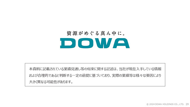 秋田製錬の2024年度の亜鉛生産については、小坂製錬の老朽化設備更新による稼働の減少に伴い、生産調整を計画しています。2023年度は低調な亜鉛需要により最適生産を実施しましたが、2024年度はコンビナート機能の健全な維持のために最適生産を継続します。ただし、これは一時的な生産調整のため、2025年度以降は需要がよほど悪化しなければ、安定生産に戻すことが可能と考えています。